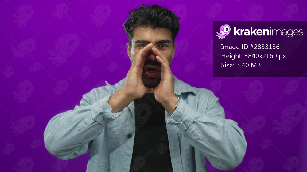 Man shouting with hands cupping mouth on a purple studio set, wearing a light denim shirt and expressive facial gesture; urgency.