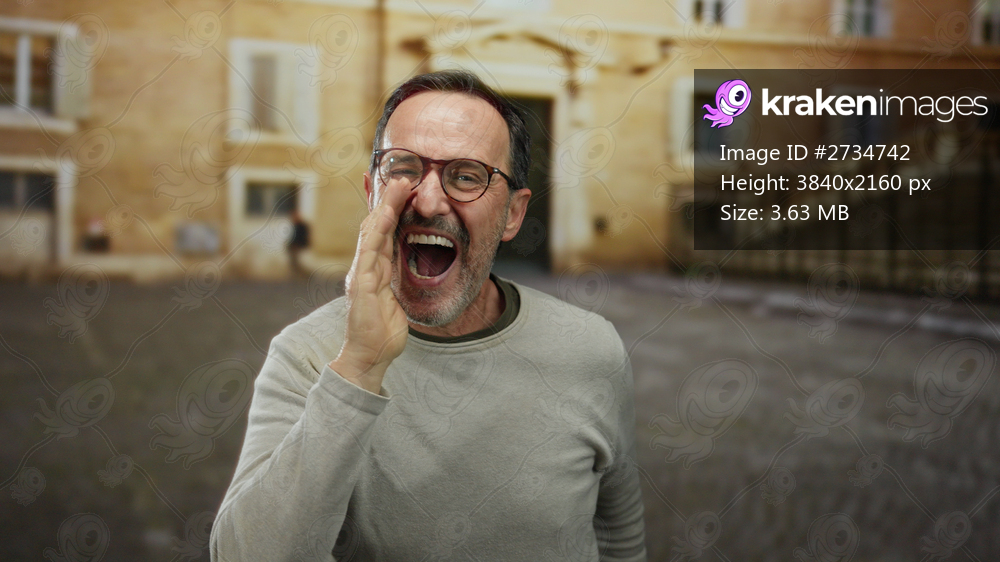 Man shouting happily in urban street setting with brick buildings in background, conveying joy and excitement while gesturing energetically outdoors.