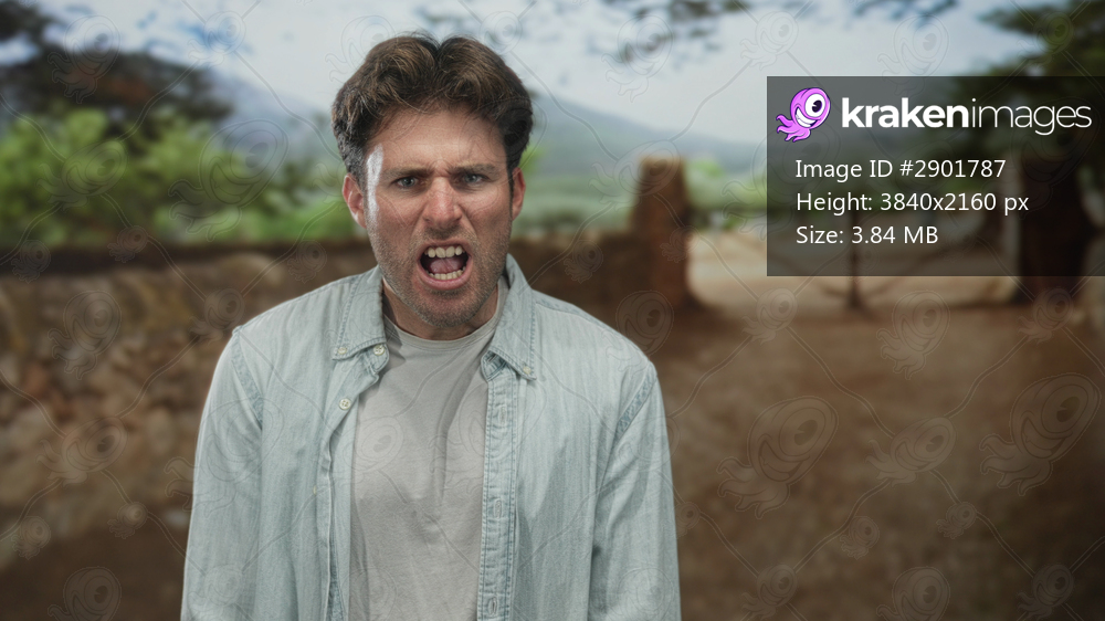 Man shouting with open mouth, face visible and teeth bared on a country street near a gate; anger confrontation.
