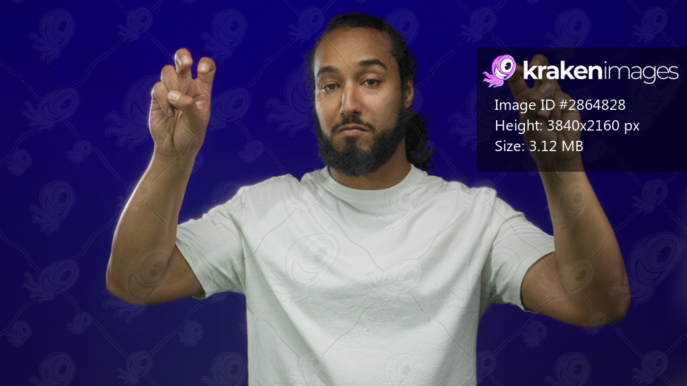 Man showing air quotes with hands in studio against deep blue backdrop, wearing white t shirt and beard; sarcasm irony.