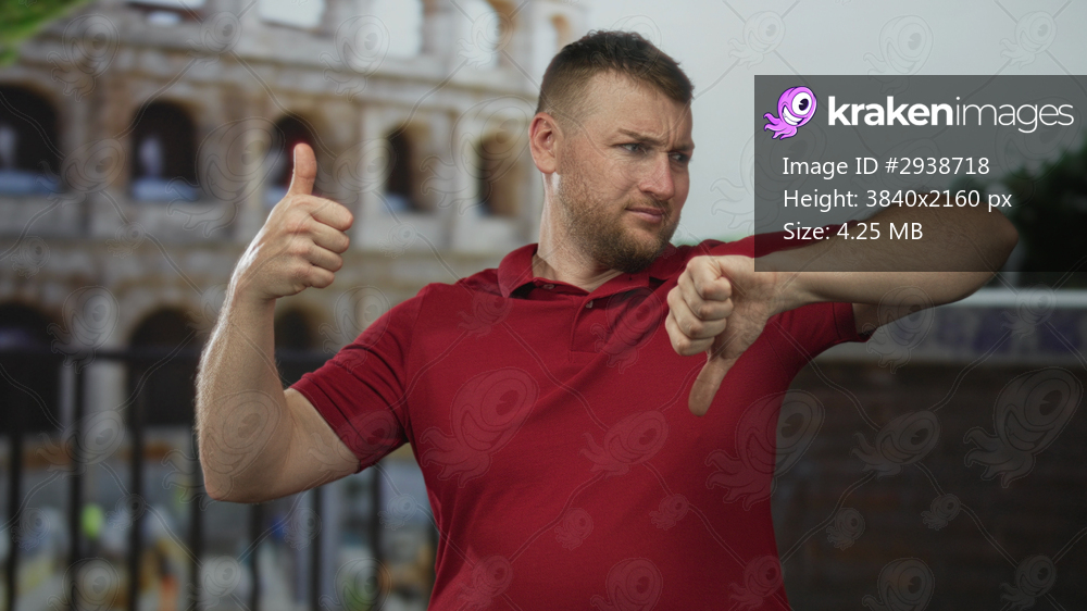 Man showing both thumbs up and thumbs down at the roman coliseum building while seated by a railing in an outdoor tourist area wearing a red polo shirt; ambivalence. - Kraken Images