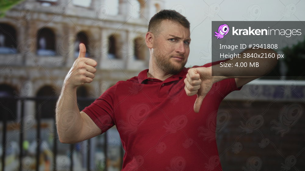 Man showing both thumbs up and thumbs down at the roman coliseum building while seated by a railing in an outdoor tourist area wearing a red polo shirt; ambivalence. - Kraken Images