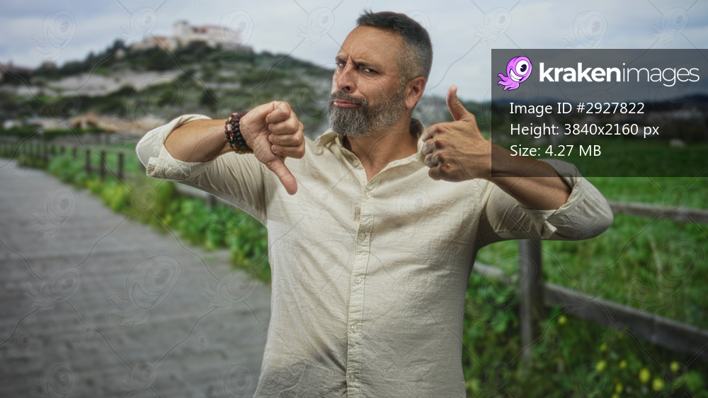 Man showing both thumbs up and thumbs down on a wooden boardwalk in countryside park; ambivalence choice contrast.