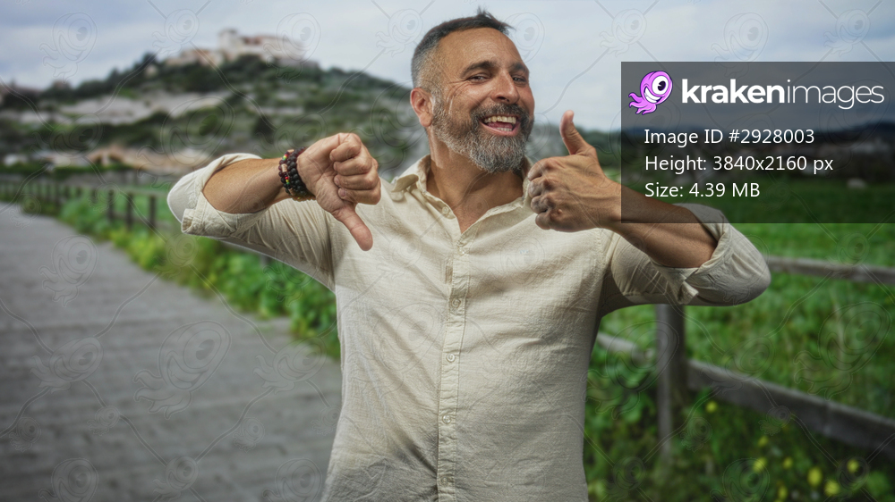 Man showing both thumbs up and thumbs down on a wooden boardwalk in countryside park; ambivalence choice contrast.