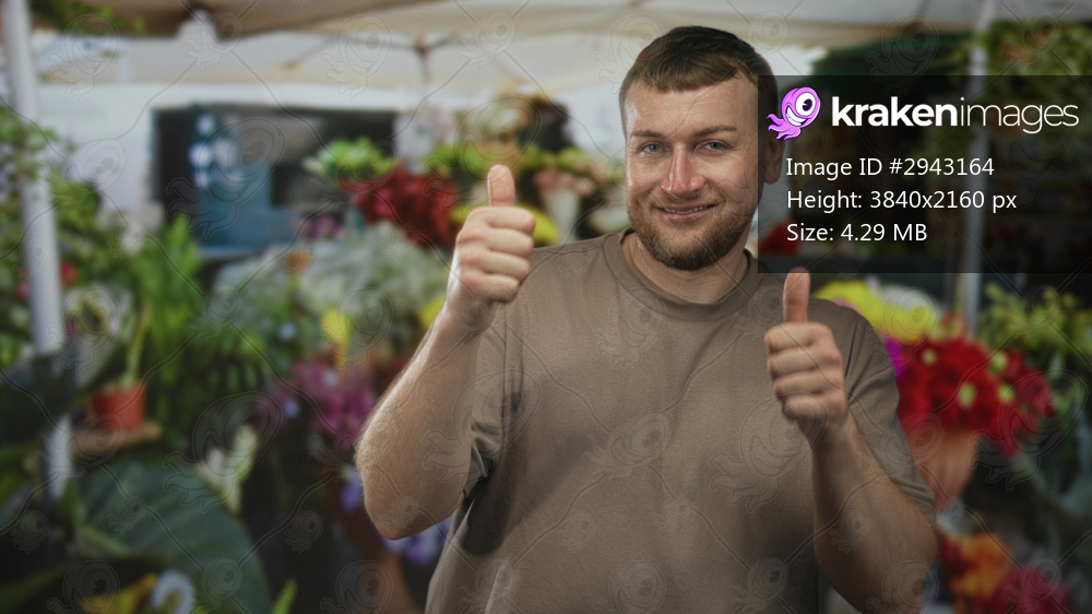 Man showing both thumbs up while smiling among colorful flowers at street market; happiness gratitude.