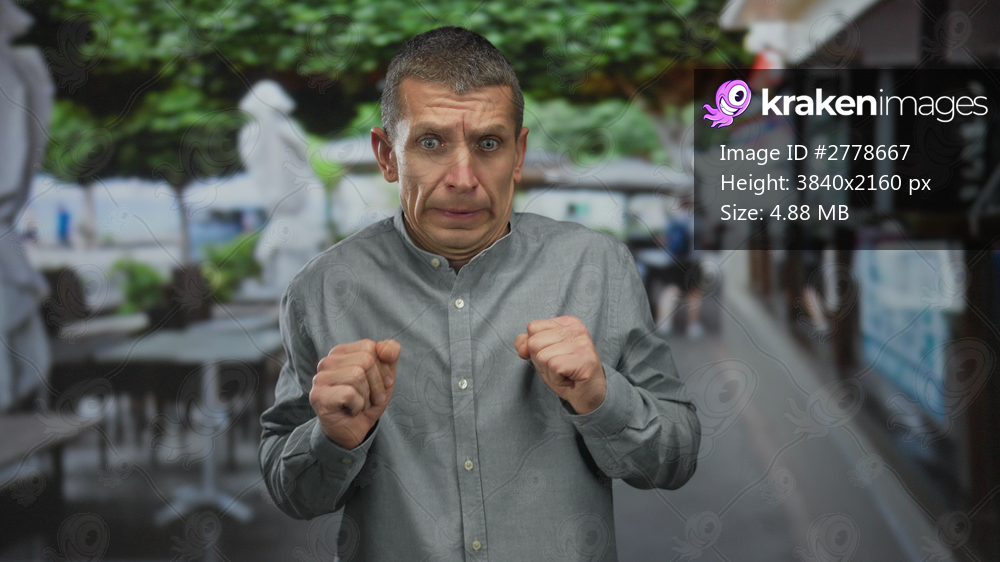 Man showing fear on outdoor restaurant terrace with blurred tables and greenery in background, expressing surprise in public urban setting.