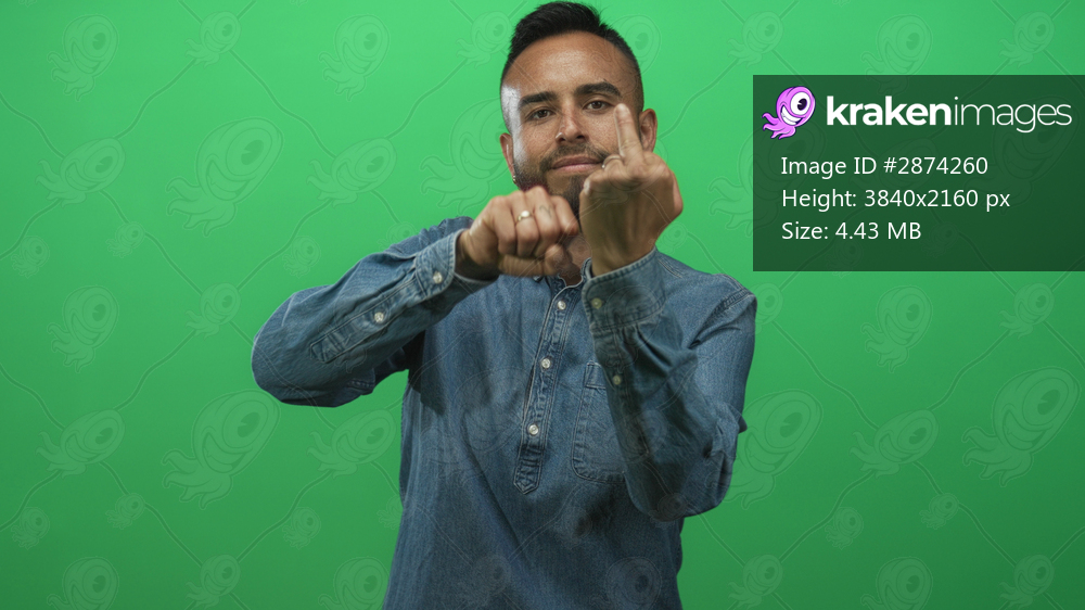 Man showing fists and raised middle finger with visible hands in green studio; defiance attitude rebellion.