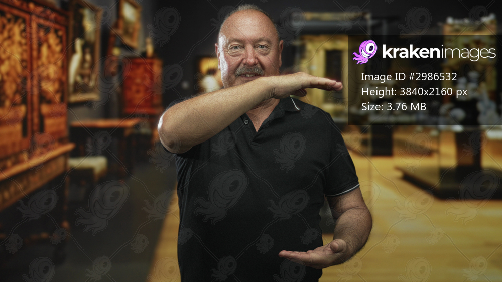 Man showing hands in a horizontal measuring gesture in a museum gallery, wearing black polo and gesturing between displays; contemplation quiet observation. - Kraken Images