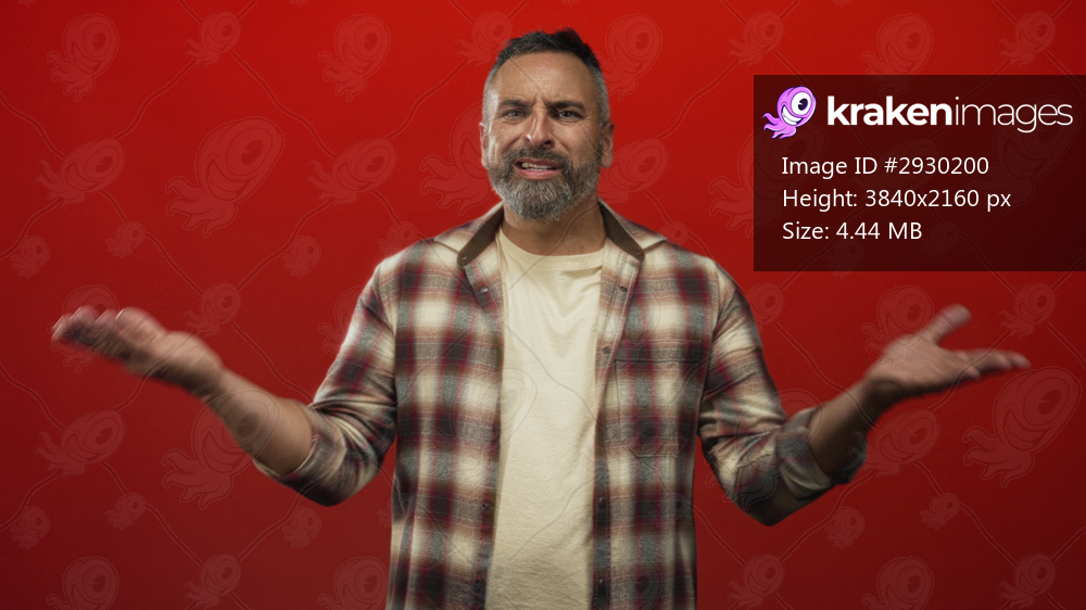 Man showing hands raised, pointing finger and open palms in red studio; frustration warning admonition stern.