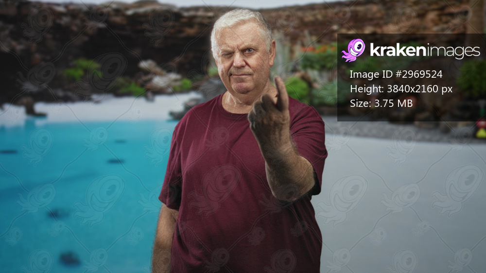 Man showing middle finger with bare hand at poolside near building, wearing maroon shirt and serious expression; defiance.