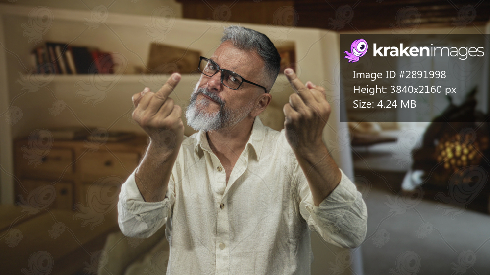 Man showing middle finger with both hands, grimacing and wearing glasses and a beige shirt in a living room building; defiance.