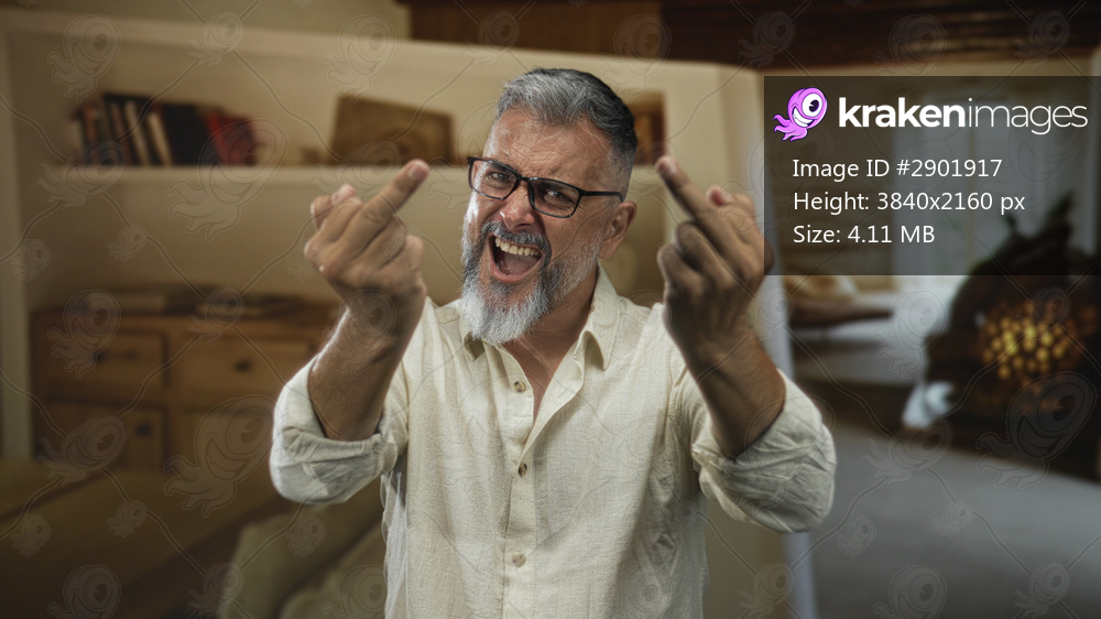 Man showing middle finger with both hands, grimacing and wearing glasses and a beige shirt in a living room building; defiance.