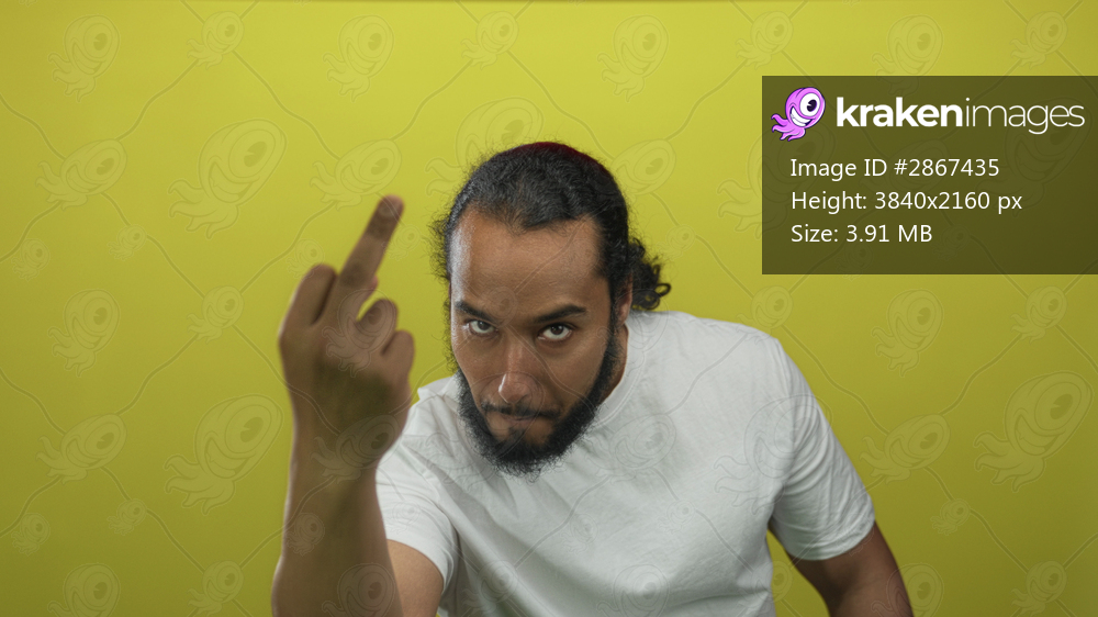 Man showing middle finger and scowling in studio with yellow backdrop, wearing t shirt; anger defiance.