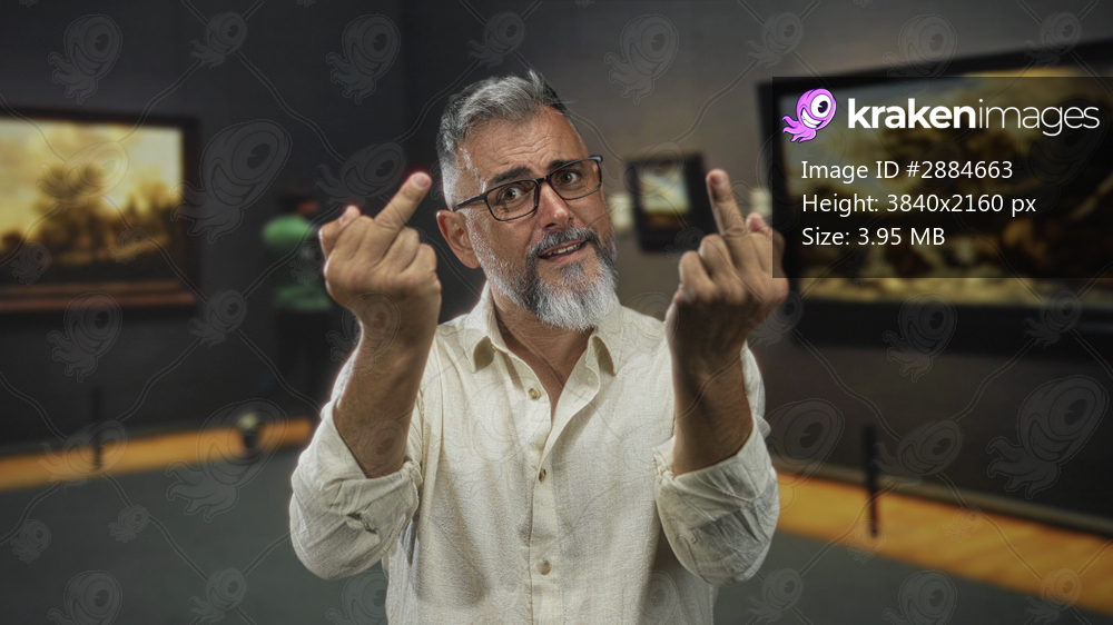 Man showing middle fingers with hands raised in gallery building, glasses visible; provocation defiance attitude.