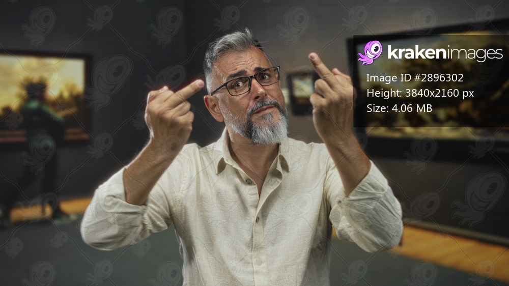 Man showing middle fingers with hands raised in gallery building, glasses visible; provocation defiance attitude.