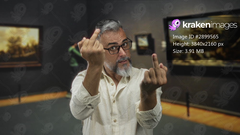 Man showing middle fingers with hands raised in gallery building, glasses visible; provocation defiance attitude.