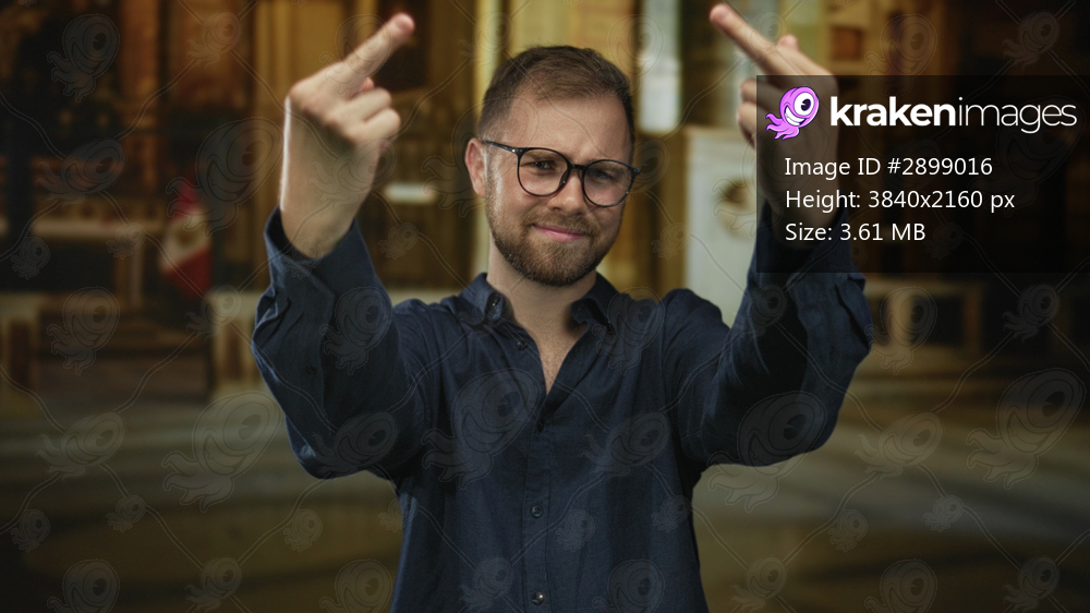 Man showing middle fingers toward camera in church building, bare hands and smirk visible; defiance.