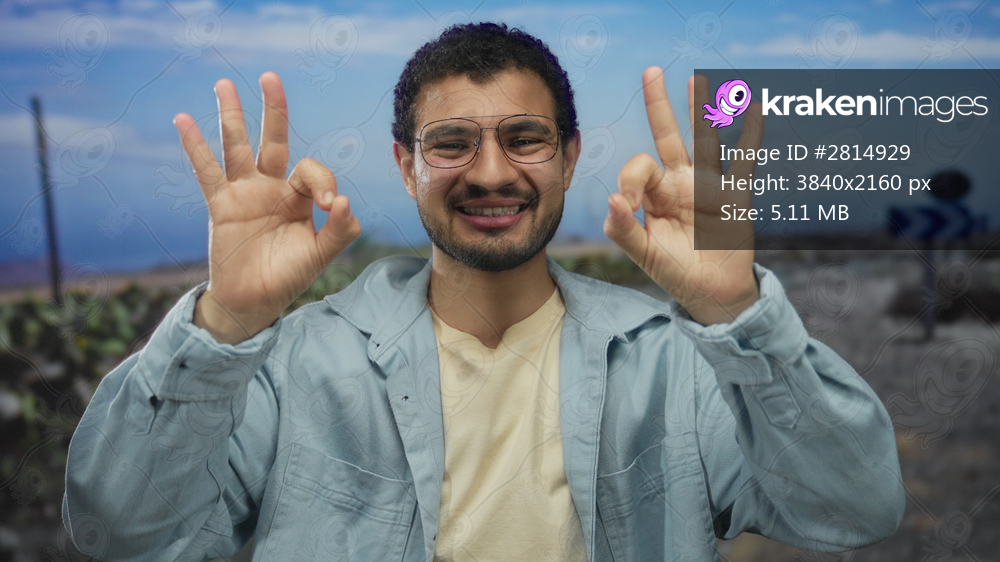 Man showing ok sign with both hands on rural street with a road sign arrow and desert plants in view; approval.