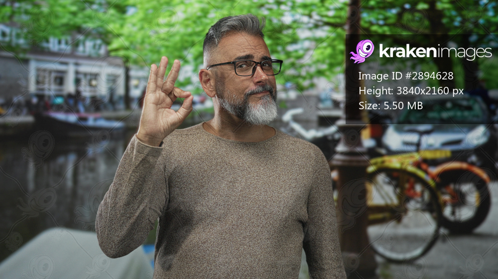 Man showing ok sign with hand on an amsterdam street canal, wearing glasses and sweater; approval travel leisure.