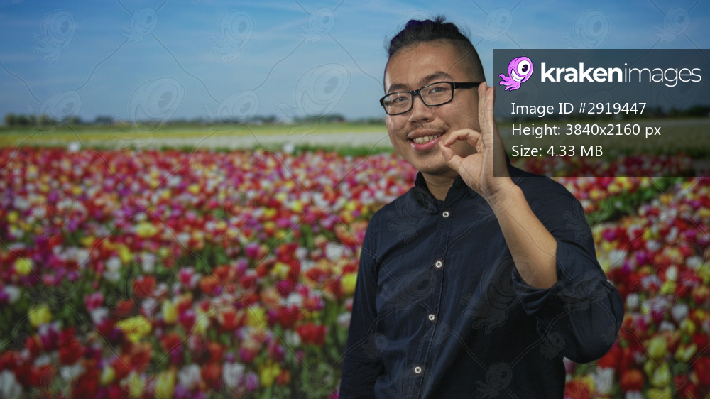 Man showing ok sign with hand and smiling in a studio tulip field under blue sky; happiness spring bloom.