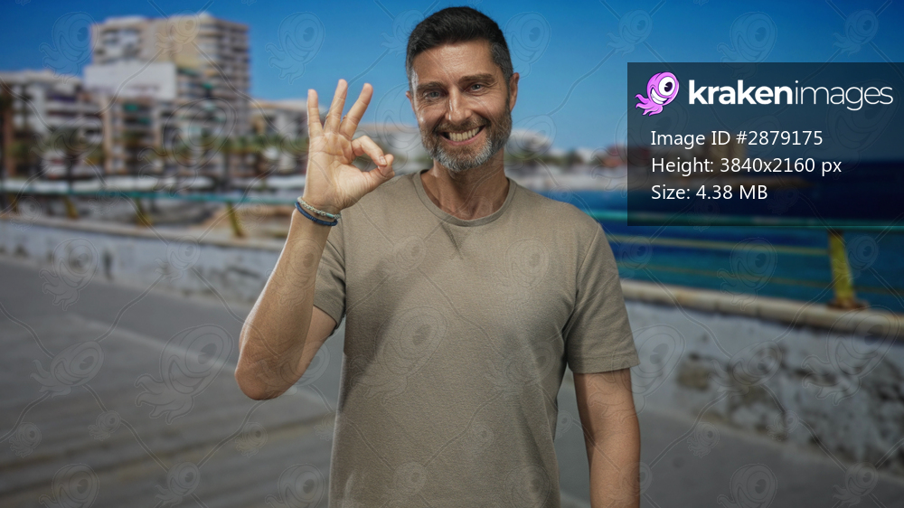 Man showing ok sign with hand and smiling on street promenade by the seaside; optimism relaxation holiday.