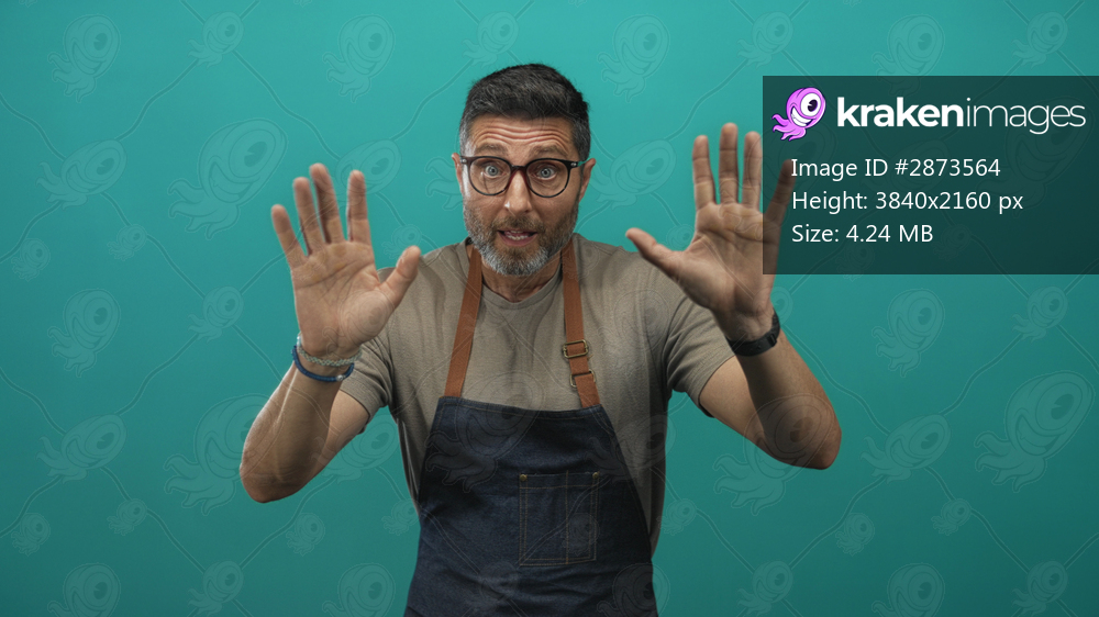 Man showing open hands and palms forward while raising both arms against a teal studio backdrop, wearing denim apron and glasses; surprise.