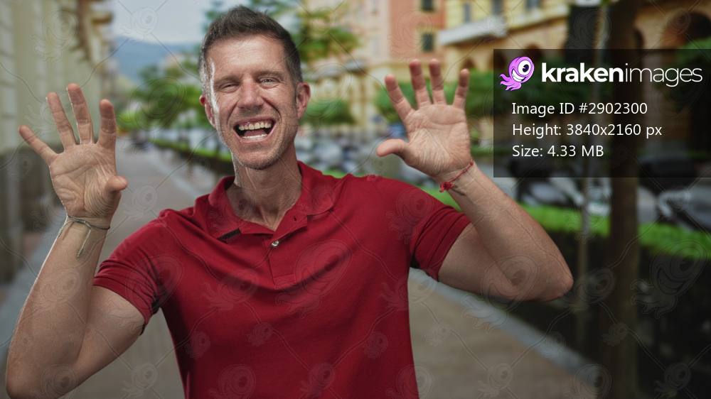Man showing open hands and smiling broadly on a city street, palms visible and fingers splayed in a playful claw gesture while wearing a red polo shirt; playful mischief. - Kraken Images
