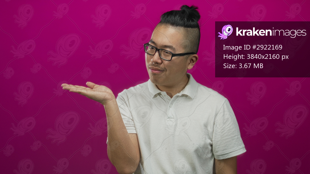 Man showing open palm facing up in studio against magenta wall wearing white polo shirt; playful curiosity product demo.