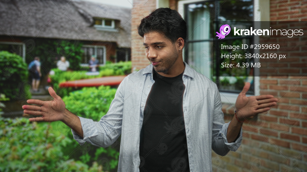 Man showing open palms gesture and closed eyes in front of brick building window, wearing casual shirt; thoughtful reflection.