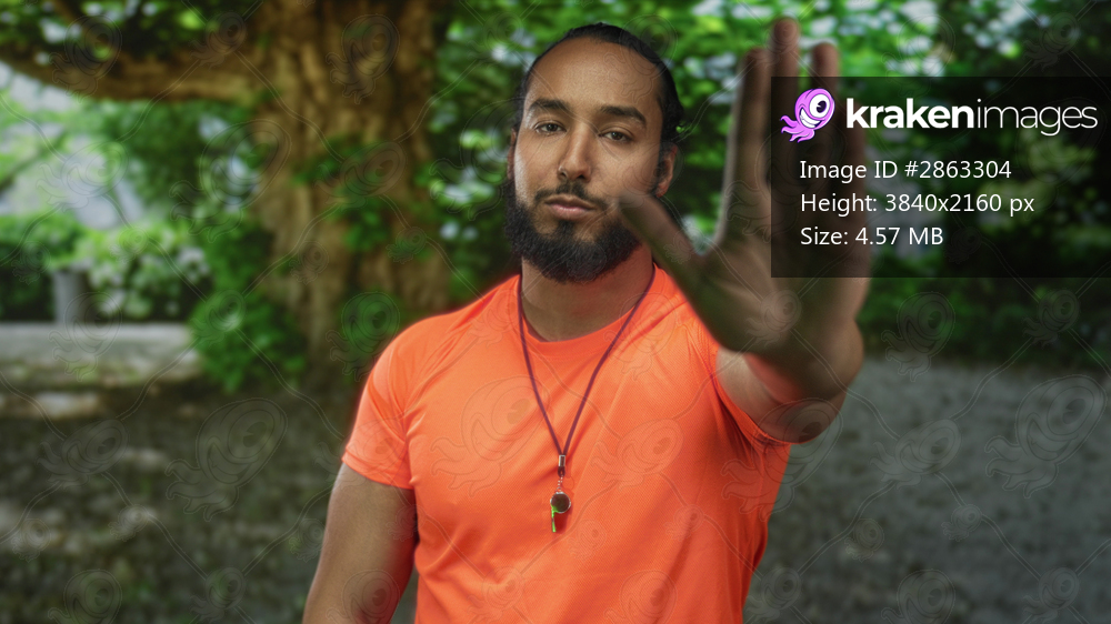 Man showing palm out stop gesture in park wearing bright orange shirt and whistle necklace, hand raised toward camera and neutral face; calm boundary assertion. - Kraken Images