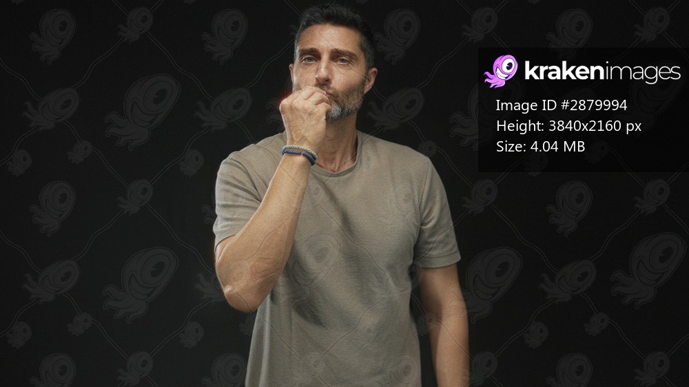 Man showing palm and pinched fingers gesture against black studio backdrop with hand near chest; frustration plea.