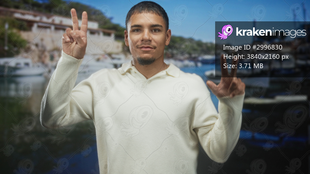 Man showing peace sign with both hands and smile, wearing cream polo sweater and gold chain in front of moored boats at a marina harbor; friendly greeting. - Kraken Images