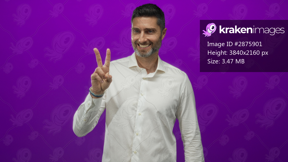 Man showing peace sign with right hand in studio against a purple wall, wearing white shirt and smiling; optimism positivity.