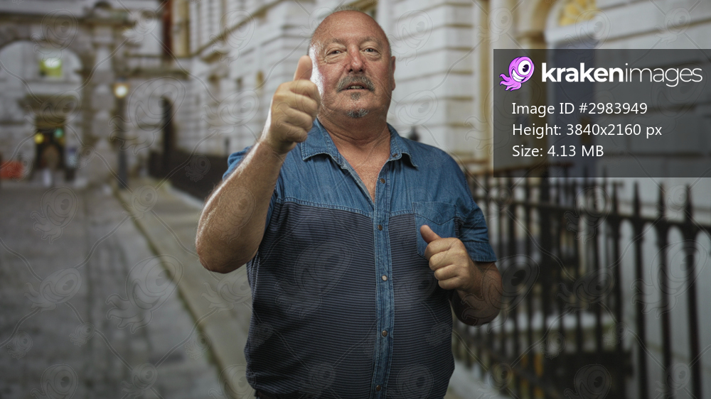 Man showing raised thumbs and smiling while making a thumbs up gesture on a street in front of stone building facade; confidence approval.
