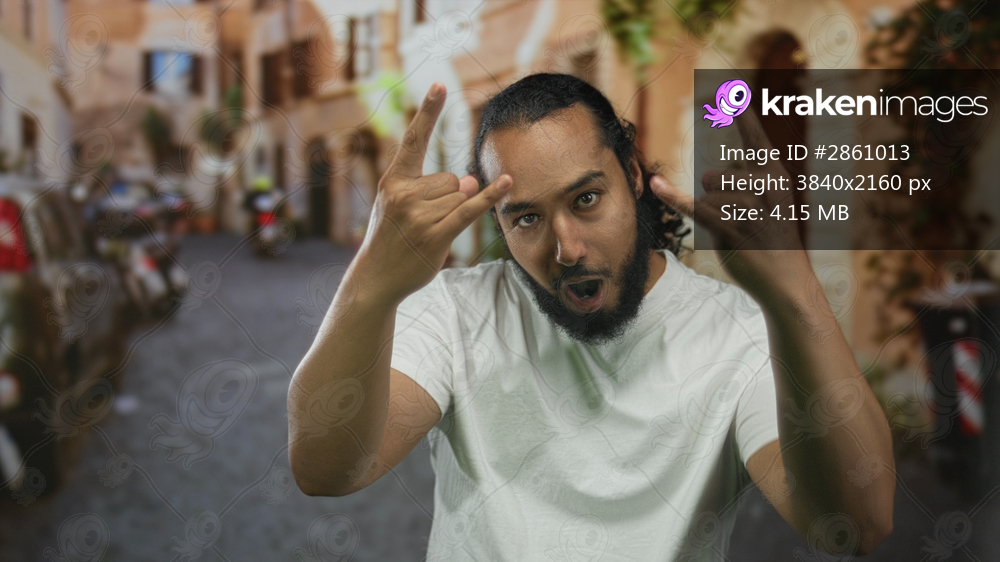 Man showing rock horns with hands and crossed forearms in narrow old town street wearing white t shirt; urban defiance.
