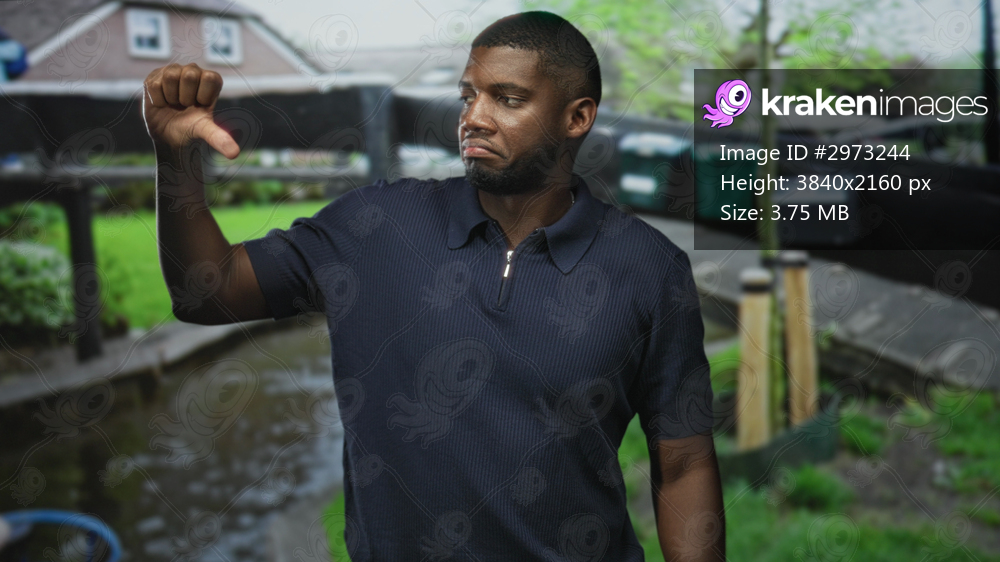 Man showing thumb down hand gesture on street beside a canal bridge and residential houses, casual polo shirt; disapproval judgment.