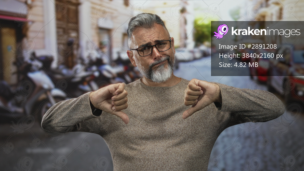 Man showing thumbs down gesture with both hands and glasses on a busy cobbled street beside parked scooters and cars, facing camera; disapproval doubt. - Kraken Images