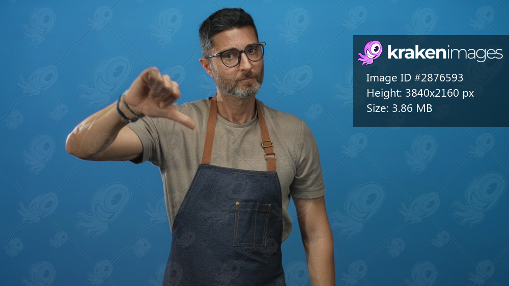 Man showing thumbs down gesture wearing denim apron in blue studio; disapproval critique feedback review.