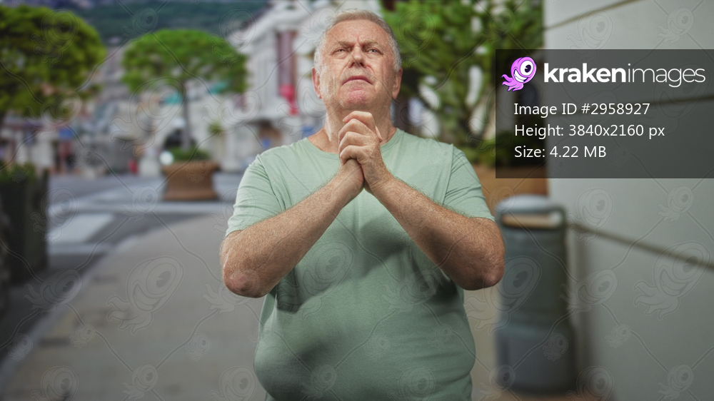 Man showing thumbs up and hands clasped on street sidewalk in front of storefront, green tshirt and serious frown; determination resilience.