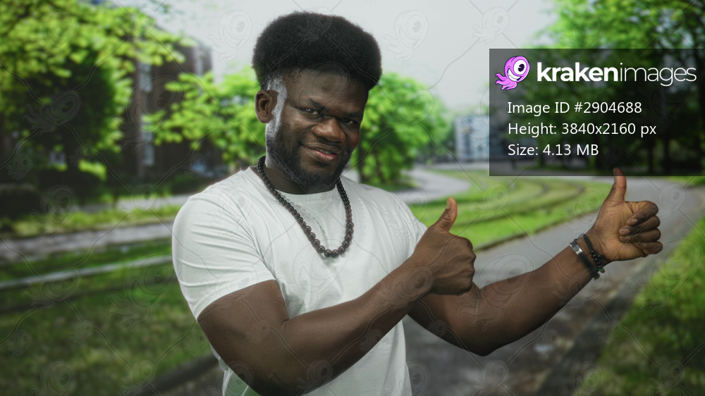 Man showing thumbs up and presenting open palms in street park wearing white t shirt and beaded necklace; confidence welcome.