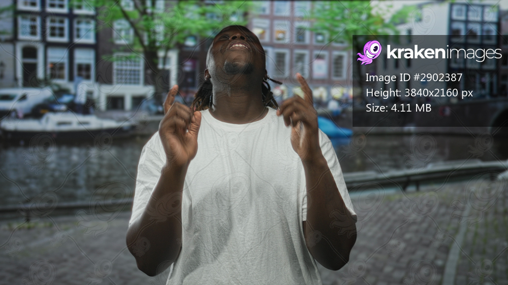 Man showing thumbs up and smiling on a street by an amsterdam canal with boats and water visible; joy celebration.