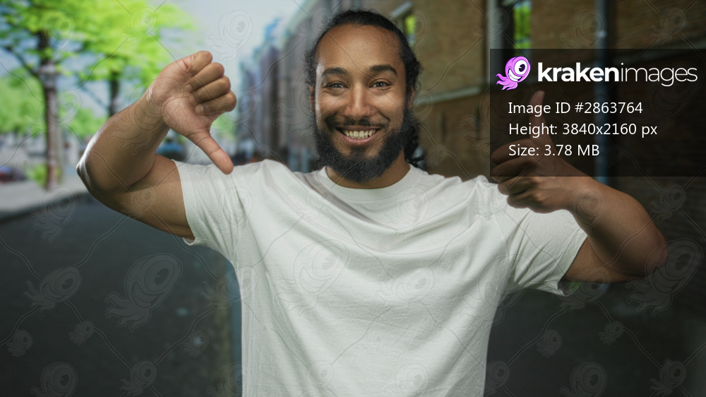 Man showing thumbs up and thumbs down gesture on a street beside a brick building; ambivalence choice.