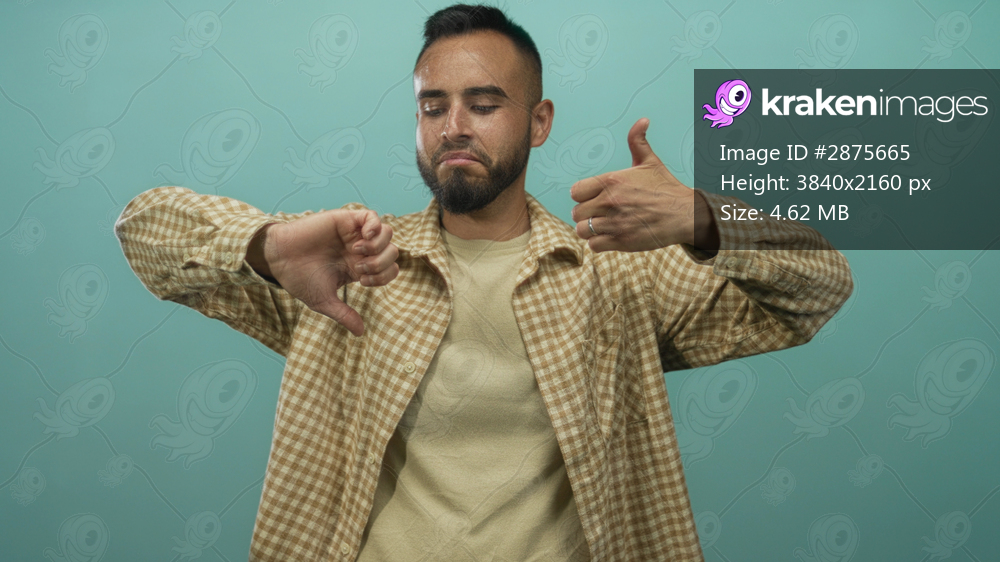 Man showing thumbs up and thumbs down in a studio with a teal backdrop and smile; ambivalence decision.