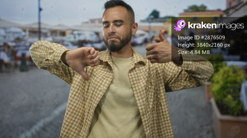 Man showing thumbs up and thumbs down with ringed hands in beige checked shirt at street cafe terrace; indecision choice.