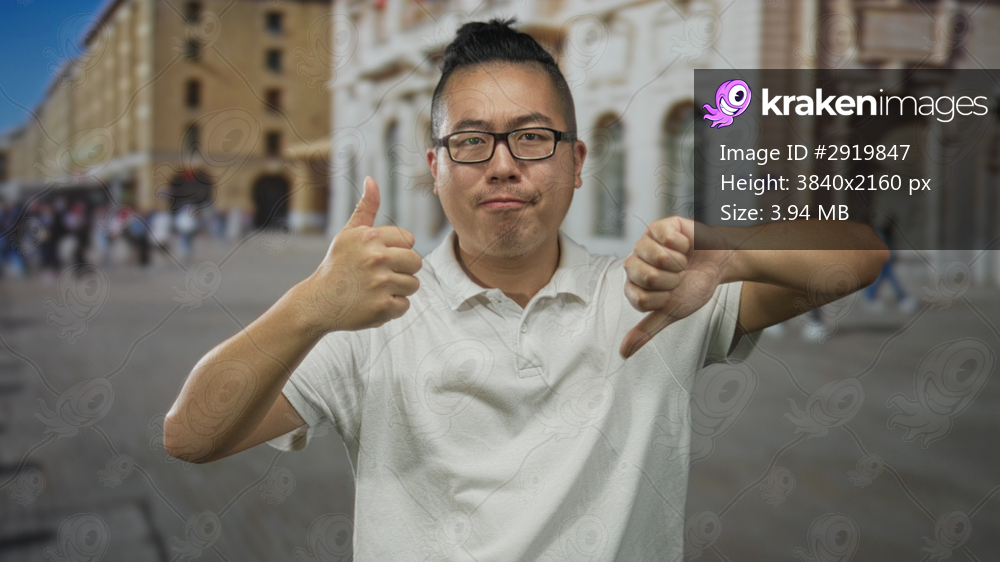 Man showing thumbs up and thumbs down with visible hands and forearms on a busy street in front of a building; ambivalence.