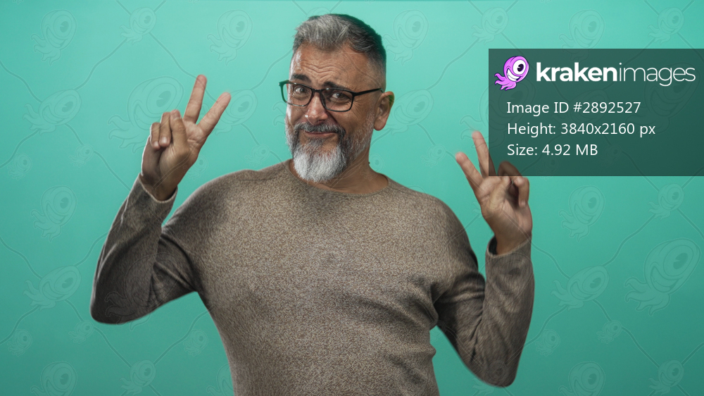Man showing two peace sign gestures with hands and glasses and gray beard in turquoise studio; playful confidence.