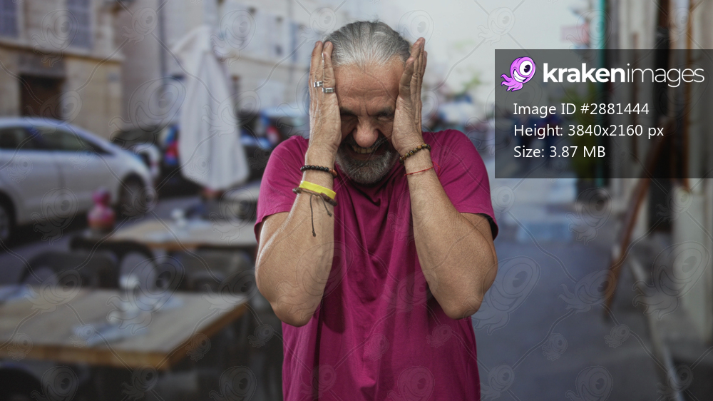 Man showing two thumbs up with bare hands at a street cafe terrace outdoors, smiling and leaning forward; joy.