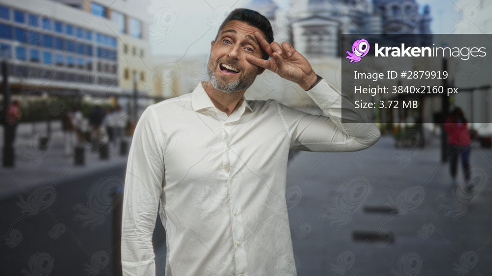 Man showing v sign by eye with visible hand on a city street, smiling and slightly tilting head; playful joy.