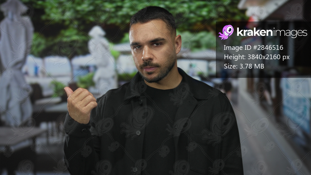 Man shows bare thumb up gesture on building terrace overlooking blurred tables and umbrellas; optimism.