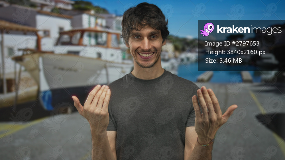 Man shows both palms gesture on sunlit street dock near white boats under blue sky; warm invitation.